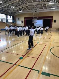 縦割りの班に分かれ、バレーボールとバスケットボールを使い、背中を向けたフリースロー大会をしました。