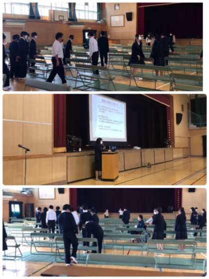 8(火)15時から保護者進路説明会を開催しました。お忙しいなか、たくさんの保護者の方にご来校頂き、ありがとうございました。また、会場準備をしてくれた3年生有志の人たち、会場の片付けをしてくれたバレー部の人たち、協力ありがとう。みんな自分で考えて行動してくれるので、速攻で準備や片付けができました。