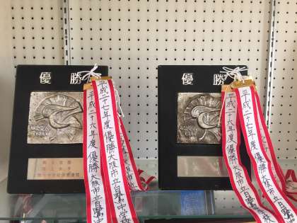 ブロック大会の優勝楯を正門入ってすぐのショーケースに展示しました!