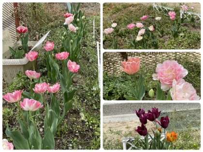 57期生の皆さん、ご入学おめでとうございます。元気アップ隊が植えたチューリップが花をいっぱい咲かせてお祝いしています!