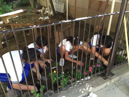 昨日、元気アップ隊がビオトープの清掃活動をし、その後に花壇をつくり、お花を植えました!