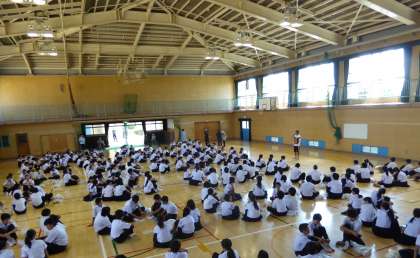 本日、学年集会後1限目に体育館をつかって、今週の土曜日に予定している防災教育の事前学習を行いました。