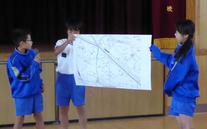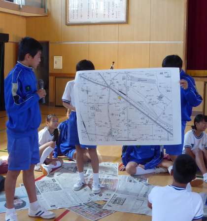 今住んでいる地域の防災マップをつくって発表している様子です。