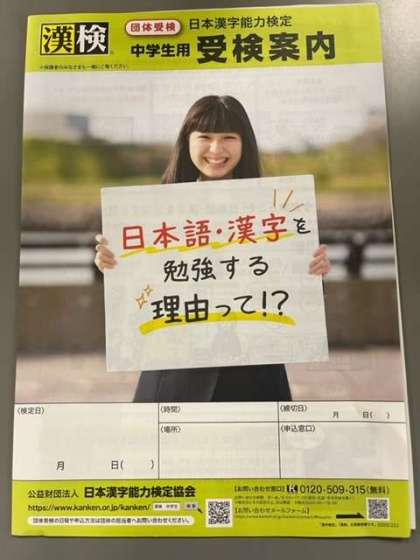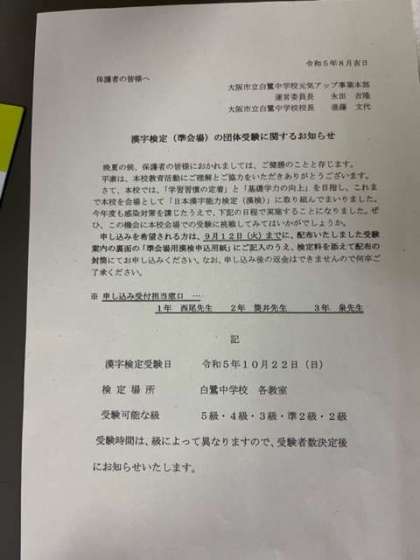 10月22日に白鷺中学校を準会場にして漢字検定を行ないます。先日お手紙と一緒に申し込み書も配布しておりますので、ぜひこの機会に挑戦してみてください。