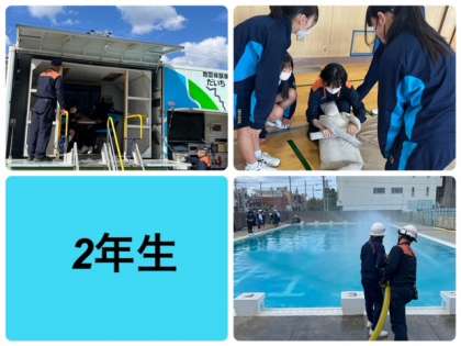 2年生ー心の減災として災害時のストレスやわらげる方法を学びました。消防署、警察署、区役所の皆様にご協力いただき講話を聞き実働訓練を行いました。