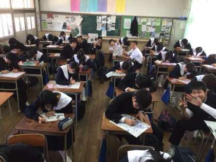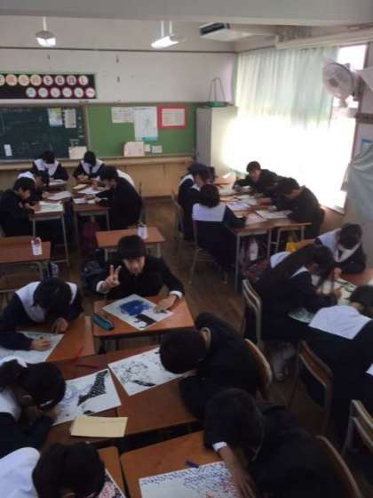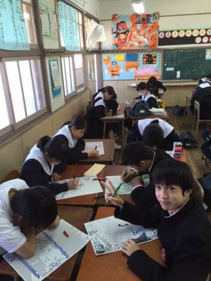 各クラスで1枚の巨大な写真を完成させます!1人、A3の紙に書かれた58×84のマス(合計4872マス!!!)を1つずつ丁寧に塗りつぶしていく作業。使う色は、黒・赤・青・緑・白の5色で、この5色だけで、様々な色が出せるんですよね〜〜。不思議です!!