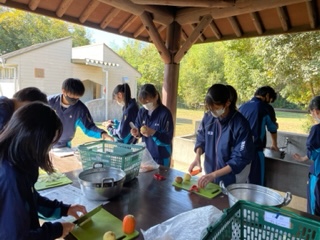晴天の下、カレー作り開始してます。