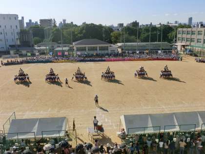 プログラムの最後は、3年生の演技です。女子の「よさこいソーラン」。『どっこいしょ〜どっこいしょ〜』『ソーランソーラン』みんなの声がそろいます。続いて男子の「組体操」気持ちが合わさって次々と大技が決まります!!技ごとに、大きな拍手が生まれていました。