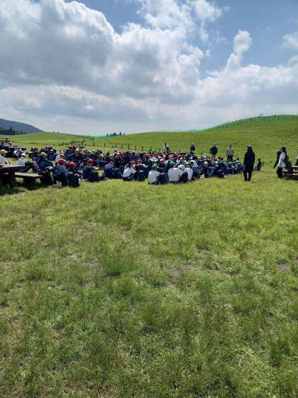 昼食、ごちそうさまでした。この後、学級ごとに集合写真をとり、ハイキングです。