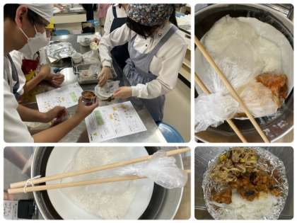 9/9(月)の放課後、東住吉区役所保健副主幹で管理栄養士の寺西さんを講師にお招きし「災害時の食」をテーマに講話とポリ袋クッキングを指導していただきました。ボランティアの皆様にもご指導いただきご飯、チキンカレー、切り干し大根の和物の3品ができあがりました。