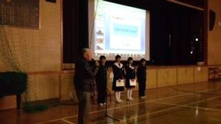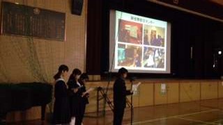 1年生の 鈴木さん、高落くん、志賀くん、山下さんが、阪神淡路大震災についての発表をしてくれました。