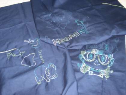 3年生で刺し子の実習をしています。刺し子とは刺繍のようなものですが、布の強度を高めたり、補修の効果もあります。自分の好きなデザインで一生懸命集中して制作に取り組んでいます。