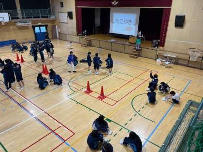 15人ほどのグループで「〇」や「△」「の」「ん」などを作ったあと、4人程度のグループに分かれて写真のような「海」や「たこ焼き」、さらには「大阪城」といった複雑なお題に取り組みました。