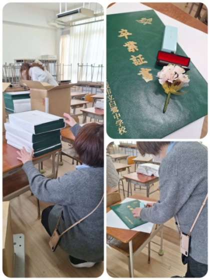 卒業式に向け、卒業証書入れや子ども達が胸につけるコサージュ、記念品の点検を1月29日(水)、30日(木)の2日間に渡り行いました。三学年委員としての最後の活動となり、いよいよ卒業が近付いてきていることを実感しました。