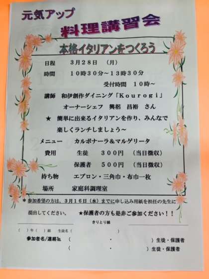 3月28日(月)10時30分〜13時30分、本校家庭科調理室