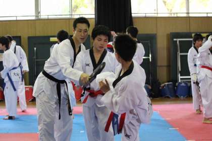 最初は、先生方がテコンドーを始めたきっかけや、試合で勝つための心構えのお話をして頂きました。実は、お二人とも(顧問の舟戸先生も)大学からテコンドーを始め、岡本先生はなんと8年間でメダリストになったそうです。常に世界一になる自分をイメージして毎日練習に励んでいたとのこと。