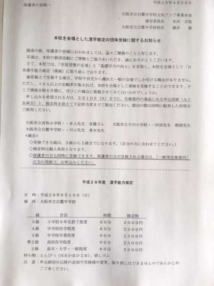 今日、白鷺中・育和小6年生・今川小6年生のみなさんに漢字能力検定の案内を配布しました。今年度から春の漢検、小学校の人も受検できるようになりました。また保護者の方の受検も可能ですので、是非いかがでしょうか?