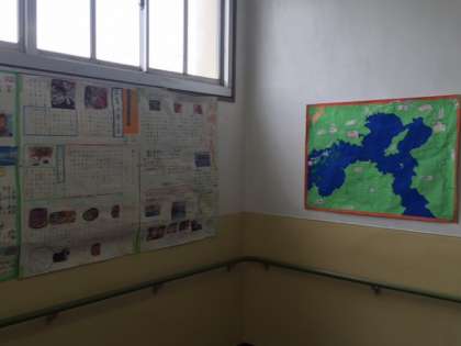 3年生が利用する階段に貼り付け、修学旅行で行く場所の特徴やオススメの食べ物などを紹介しています(^-^)/