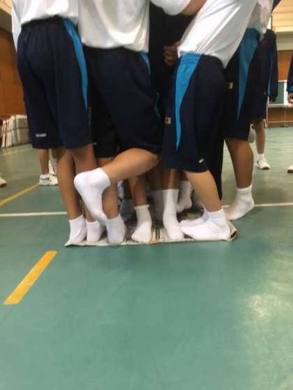 一泊移住移住2日目。現在1組と2組は体育館で「新聞乗り大会」。クラス団結して、ピア・サポート精神発揮中です。