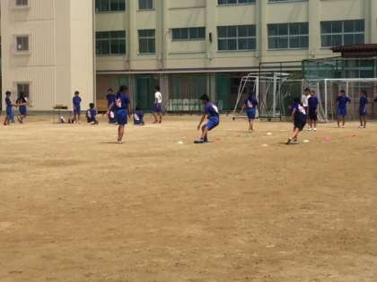 写真の奥は変形ダッシュをしている長距離陣、手前は言われた番号のマーカーを素早くタッチして瞬発力と脳を鍛えている短距離陣です。