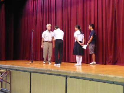 その中で、防災ALTのメンバーの募金活動に対しての思いの発表、また募金の領収書の贈呈も校長先生よりしていただきました。