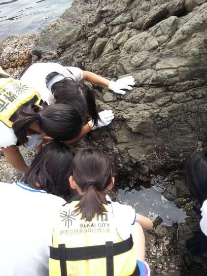 磯観察では生き物探しに夢中でした。宝探しみたいですね!カニ・ヤドカリなどいっぱいいました。あっ!!気がついたら足下、びしょびしょですよ☆