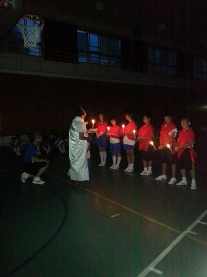 夜の活動では、火の神を迎えて始まったキャンドルファイヤー。まずは校歌合戦からスタートしました。各クラス、声をそろえて校歌を披露しました。優勝クラスは・・・まだヒミツ☆