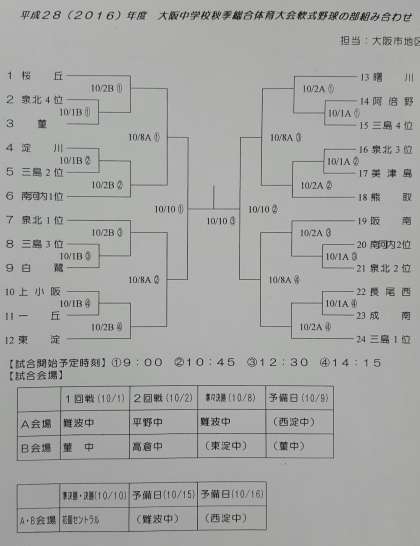 大阪中学校秋季総合体育大会の組み合わせです。三島3位は吹田一中学校です。