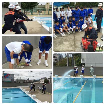 この1枚目はプールサイドで可搬式ポンプを使った吸放水訓練で、実際に放水を体験しました。