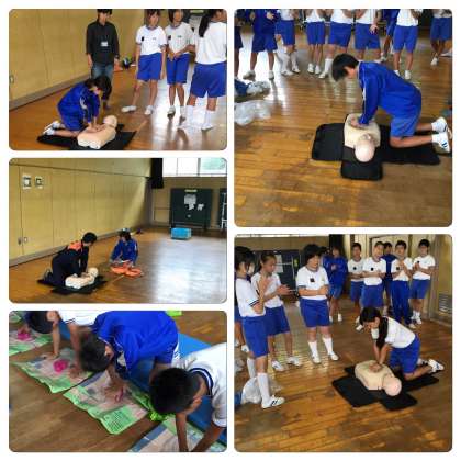 2枚目はAEDを使用した救命救急訓練です。人形を使って訓練しました。