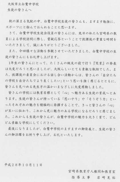 先日、学校訪問に来られた宮崎県の先生から、生徒のみなさんへお礼のお手紙をいただきましたので、披露いたします。