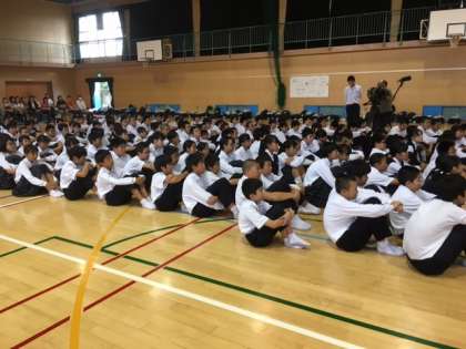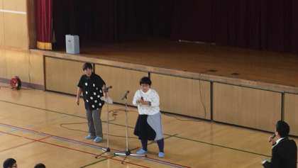 さあ、本番がスタート。まずは、1組男子によるコンビ「シーフード」からのスタート。トップバッターは緊張したかと思いますが、がんばってくれました。続いては2組女子コンビ「ももなな」。身振り手振りを交えた漫才、一生懸命さが伝わってきましたね。出囃子と共に入場し、次々と発表する各グループ・・・今日の発表会では、何と全84組が出場し、約240名の前で発表するという貴重な体験をしました。みんなほんとによくがんばりました。