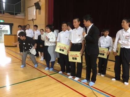 そして審査員(チキチキジョニーさんと松竹芸能・宮島さん)の厳正な審査の結果、下記のペアが入賞しました!! 今回入賞したペアについては、10月27日(木)の白鷺中学校全体の文化祭で漫才を披露します。また第1位〜第3位については、道頓堀角座の舞台で、プロの芸人さんとともに舞台に立つ権利を獲得しました。