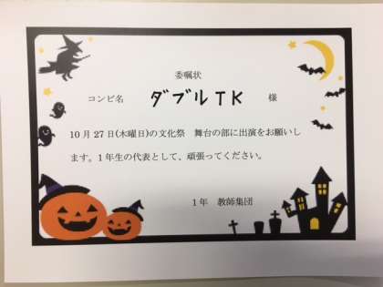 ちなみに添付画像は、本日優勝したダブルTKへの、学年職員からの文化祭委嘱状です。