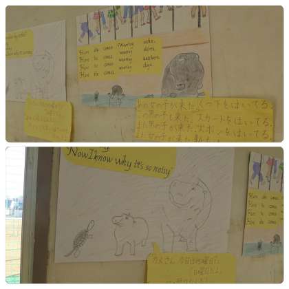 1枚目は左下が家庭科調理レシピ、右上が1年1泊移住スケッチ、左下が元気アップ報告、右下が2年キャラアトライ報告です。