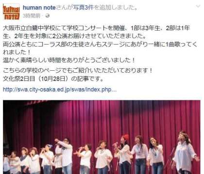文化祭二日目の音楽鑑賞で来校してくれたHumanNoteさんのFacebookに白鷺中学校のホームページが紹介されました。