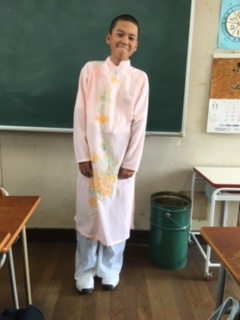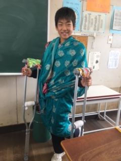 1年地理の授業で、本物の民族衣装「インドのサリーとベトナムのアオザイ」を紹介しました。男子が代表でモデルになってくれました。(本来、女子ですが、恥ずかしいからか、なかなか手があがらず、男子がモデルになってくれました。)サリーをうまく着付けることができず、すみません・・(地理担当 青木) サリーを伸ばした時の長さに、みんな圧倒されていました。