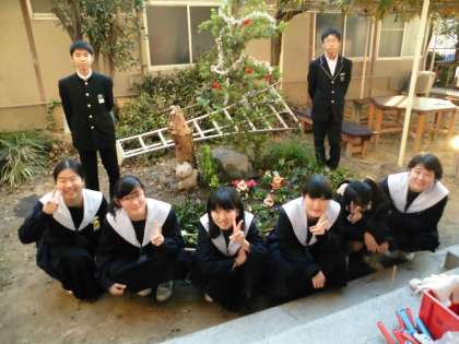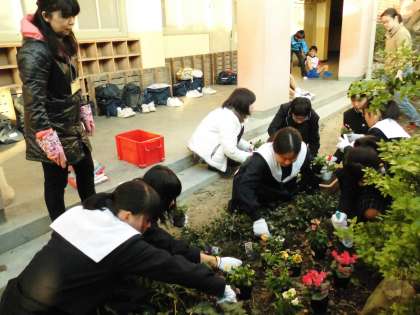 正門前のプランターを植え替えた後、元気アップ隊の生徒のみなさんと