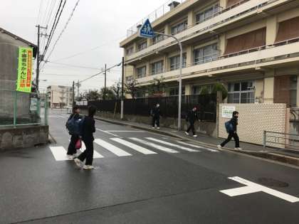 12/13(木)「雨」→足元が悪く、通勤関係の車もたくさん通っていますが安全に登校中しています。今日も元気にあせらず、あわてず、登下校。