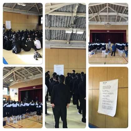 本番は1組〜6組で競いますが、今回は男子は小体育館、女子は体育館に分かれて全体練習をしました。