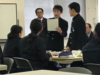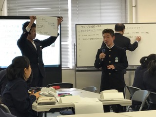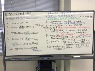 その後、他の中学校の生徒とブループ討議を行い、各ブループの意見を発表、質疑応答を行いました。