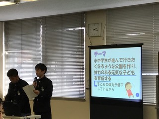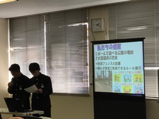 白鷺中学校は、「小中学生が進んで行きたくなるような公園を作り、体力のある元気な子供を育成する。」をテーマに、ボールで遊べる公園の増加と、大型遊具の充実を提案するプレゼンを行いました。