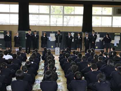 11(火)の2年生学年集会では、学年全員が、各種委員・各係ごとで、学年全員の前に出ました。みんなの前に出るのは緊張するけれど、笑育で漫才したことを思い出せば、へっちゃらですね(笑)また、先生達もそれぞれが、自己紹介をし、みんなからの「質問タイム」も設けました。「好きな食べ物はなんですか?」という可愛い質問から、「彼女はいますか?」という質問まで・・ちなみに、E先生は「いちごタルトが好き」で、I先生は「告白されたことはあります。」とのこと。みんなで大爆笑し、楽しいひとときでしたね。こんなにあったかい雰囲気でスタートがきれることを、先生達はとても嬉しく思っています。