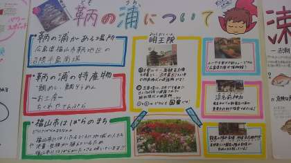 (写真左:今日の体育大会全体練習風景 右:3年生の階段に掲示してある修学旅行の調べ学習の一部)