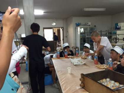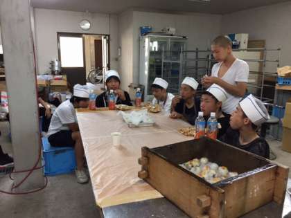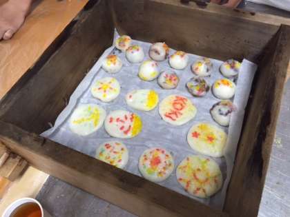 子どもたちの前にあるあられ、製造者に自分たちの名前が入っています!