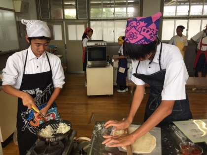 2年生の家庭科でピザとオレンジゼリーを作りました。玉ねぎのみじん切りに目頭をおさえながらも頑張って交代しながら切ることができました。