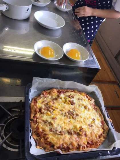 出来上がったピザがとても具沢山で、焼き立てアツアツをいただきました。