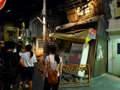 阪神大震災の街並みを再現しているフロアでは、どのような場所が危険なのか説明していただきました。
