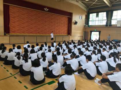 2年生・朝の学年集会、2学期は体育館で行います。毎回、学年の先生が順番にいろんな角度からのお話をしていますが、今日の集会からは、2巡目になり、M先生のお話でした。そして…明日はいよいよ2年生水泳大会。楽しみです。