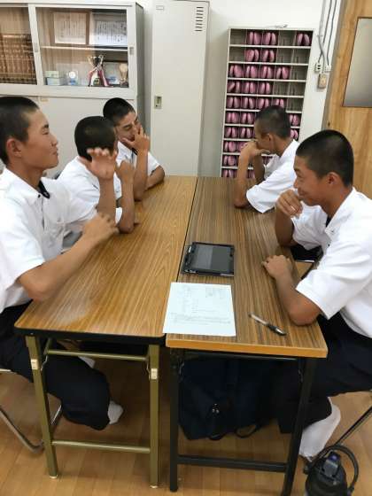 2年生、明日は水泳大会。今日の放課後、各係の人が明日の準備をしてくれました。写真は、男子委員長の最終打ち合わせの様子です。